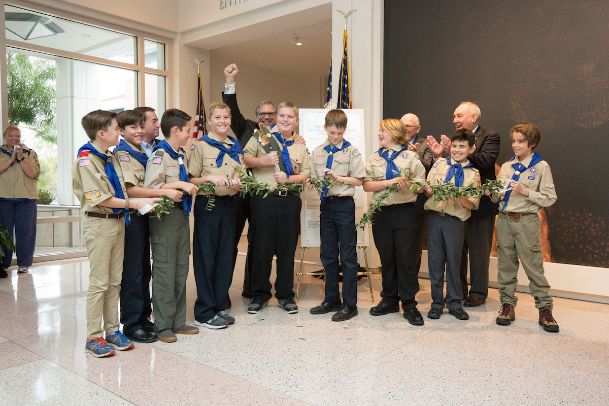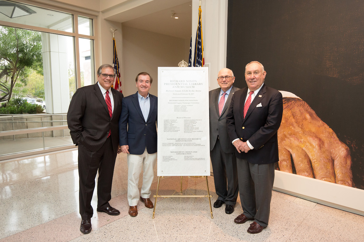 The dedication included the unveiling of the final piece of the new museum, a plaque that recognizes the leadership of the Nixon Centennial Legacy Campaign and the management, design and construction partners of the project. The plaque was unveiled by Nixon Foundation Chairman Ron Walker, Nixon Foundation President and CEO William Baribault and Nixon Library Director Michael Ellzey.