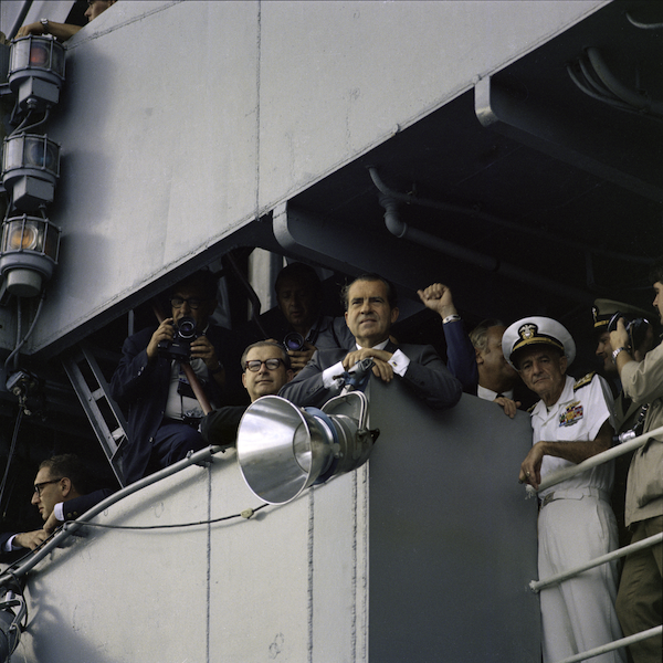 President Nixon aboard the USS Hornet observing the splash down of the Apollo 11 astronauts in the South Pacific on July 24, 1969. (Richard Nixon Presidential Library)