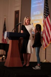 MacCallum was welcomed by a crowd of over 700, including a WWII Veteran who served during the battle of Iwo Jima. She welcomed questions from the audience after concluding her remarks. When a school age girl asked MacCallum about her job at Fox News, MacCallum invited her to the stage to personally encourage her to follow her passions.