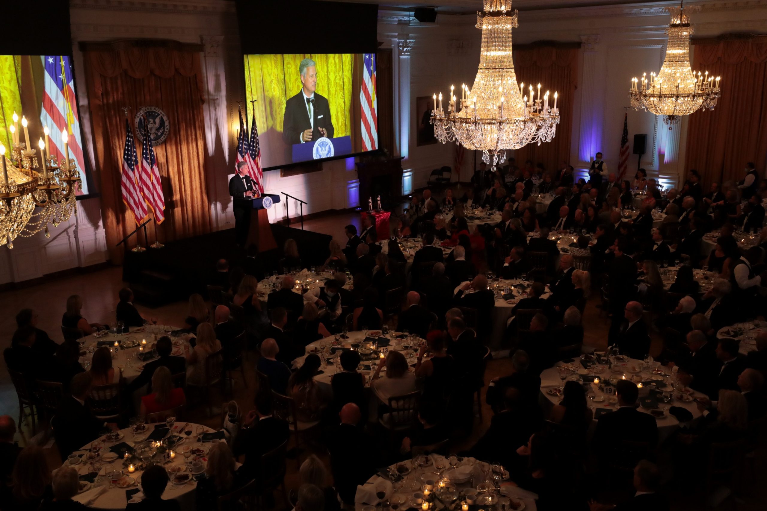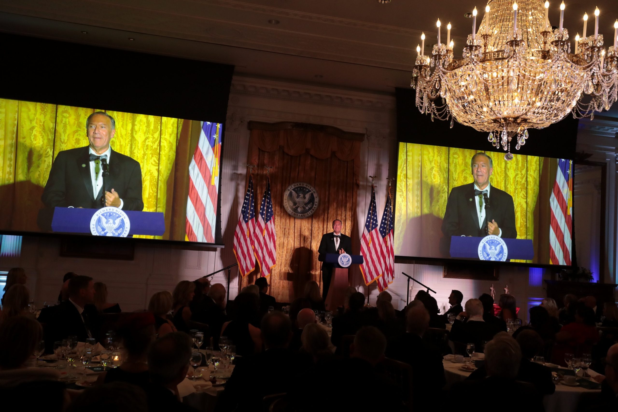 Last evening, 250 friends, benefactors and admirers gathered in the Nixon Library’s East Room to pay tribute to two men whose names now join an elite pantheon of notable Architects of Peace: former Secretary of State Mike Pompeo and former National Security Adviser Robert C. O’Brien.