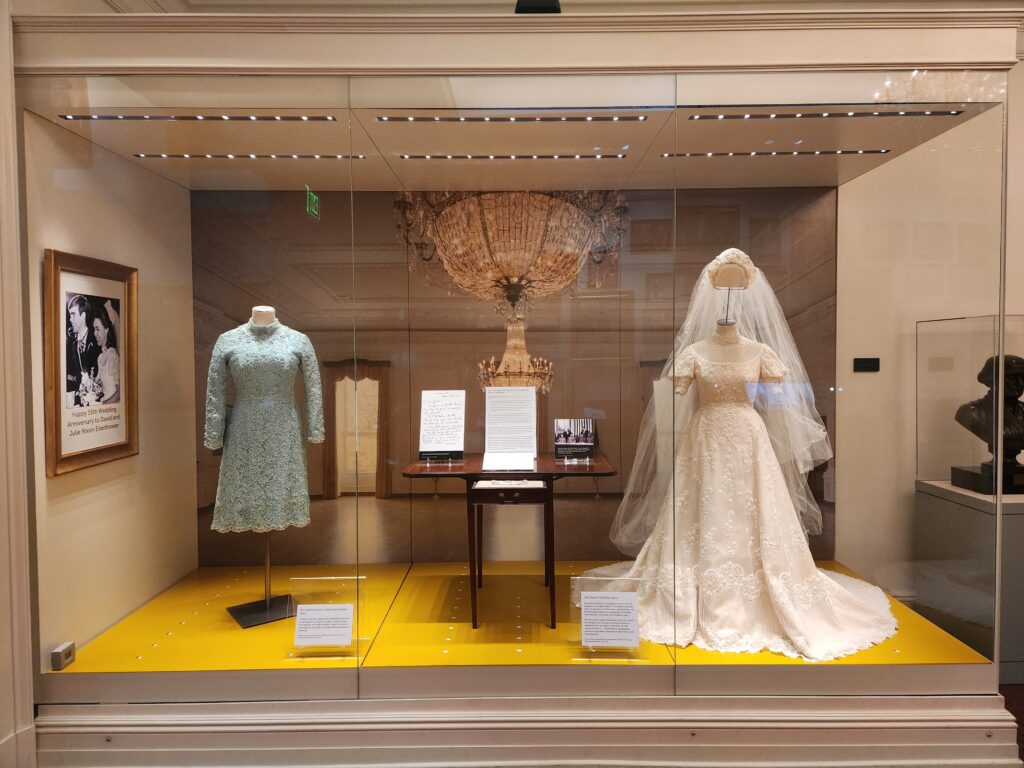 This is the first time Mrs. Nixon’s mother-of-the-bride gown has been on public display. The last time Julie Nixon Eisenhower’s wedding dress was displayed was 2017. Visitors can also view the engagement dress of Tricia Nixon Cox, who celebrated her fifty-second wedding anniversary with Edward Cox in June of this year.