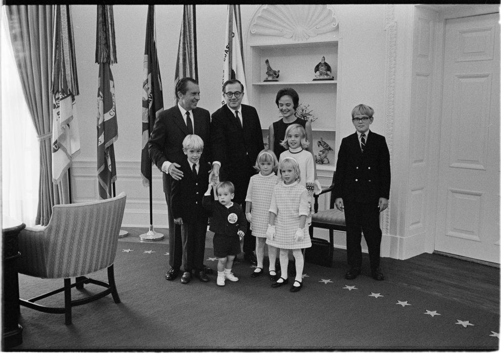 President Nixon with Richard V. Allen and his family in the Oval Office in 1969.