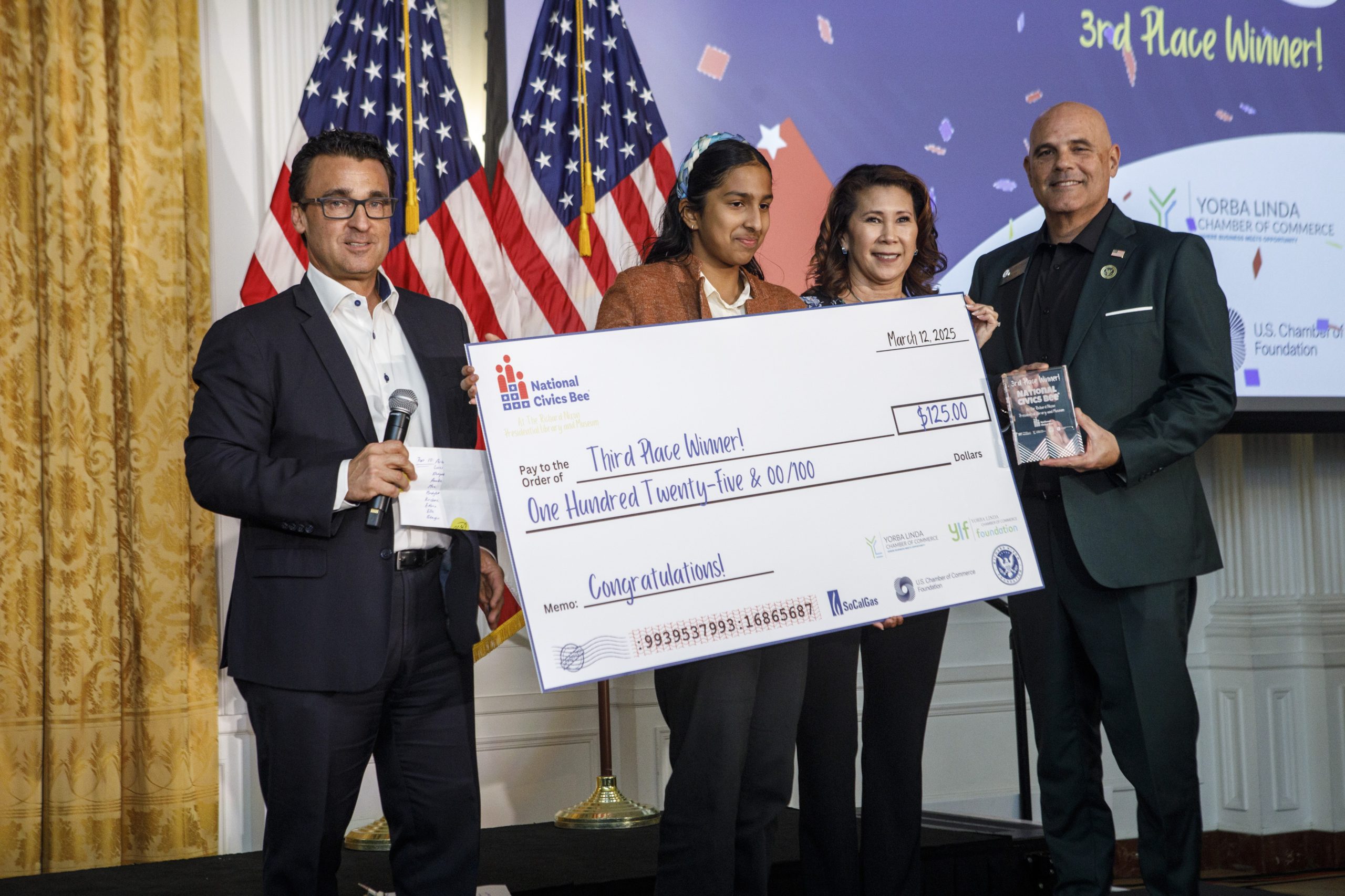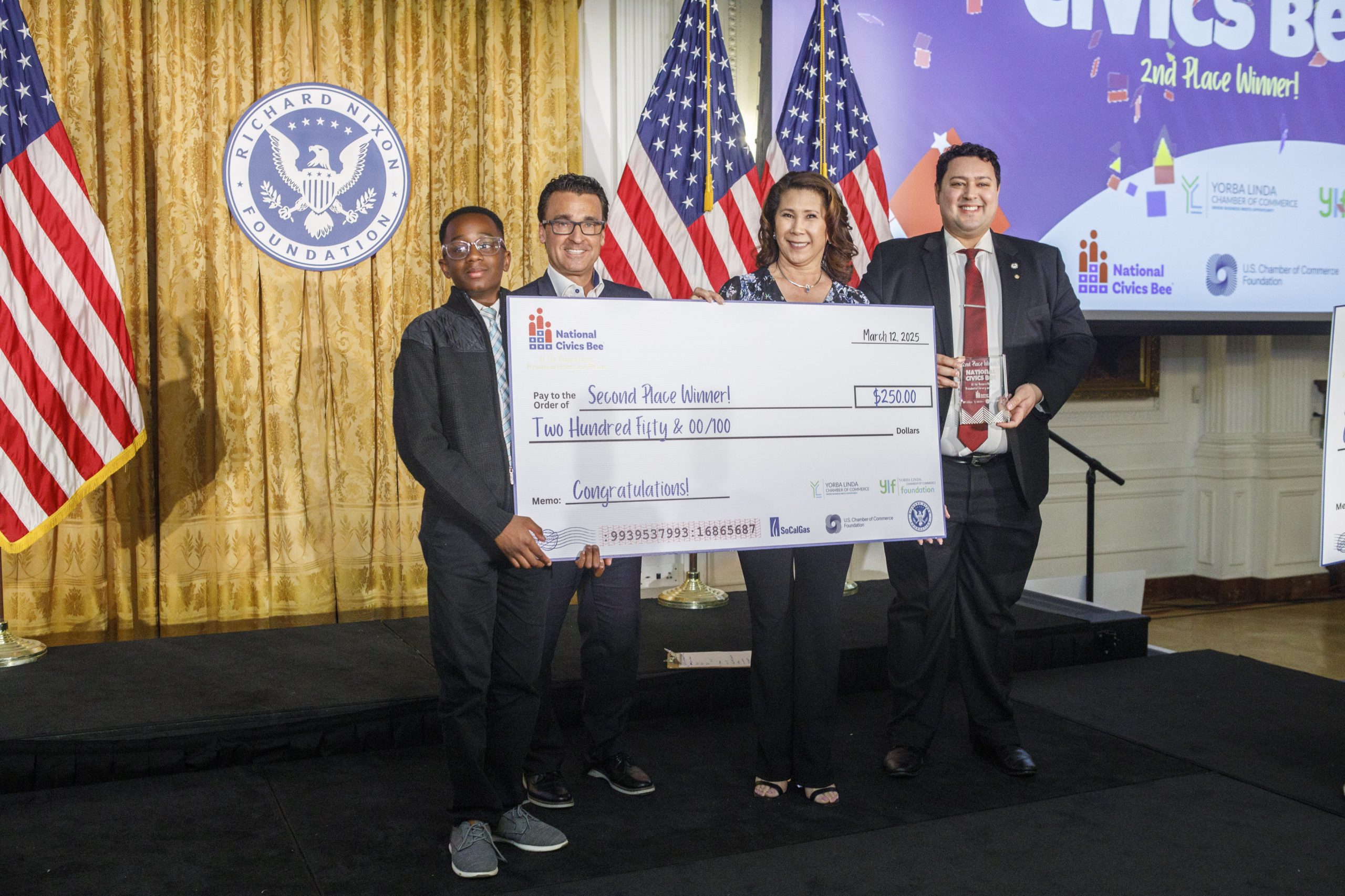This historic regional competition of the National Civics Bee was sponsored by a partnership between The Yorba Linda Chamber of Commerce, the U.S. Chamber of Commerce Foundation and the Richard Nixon Foundation. Middle schoolers from public, private and home schools in Southern California were invited to enter the competition by submitting an essay describing a problem in their community that they would solve using civic principles.
