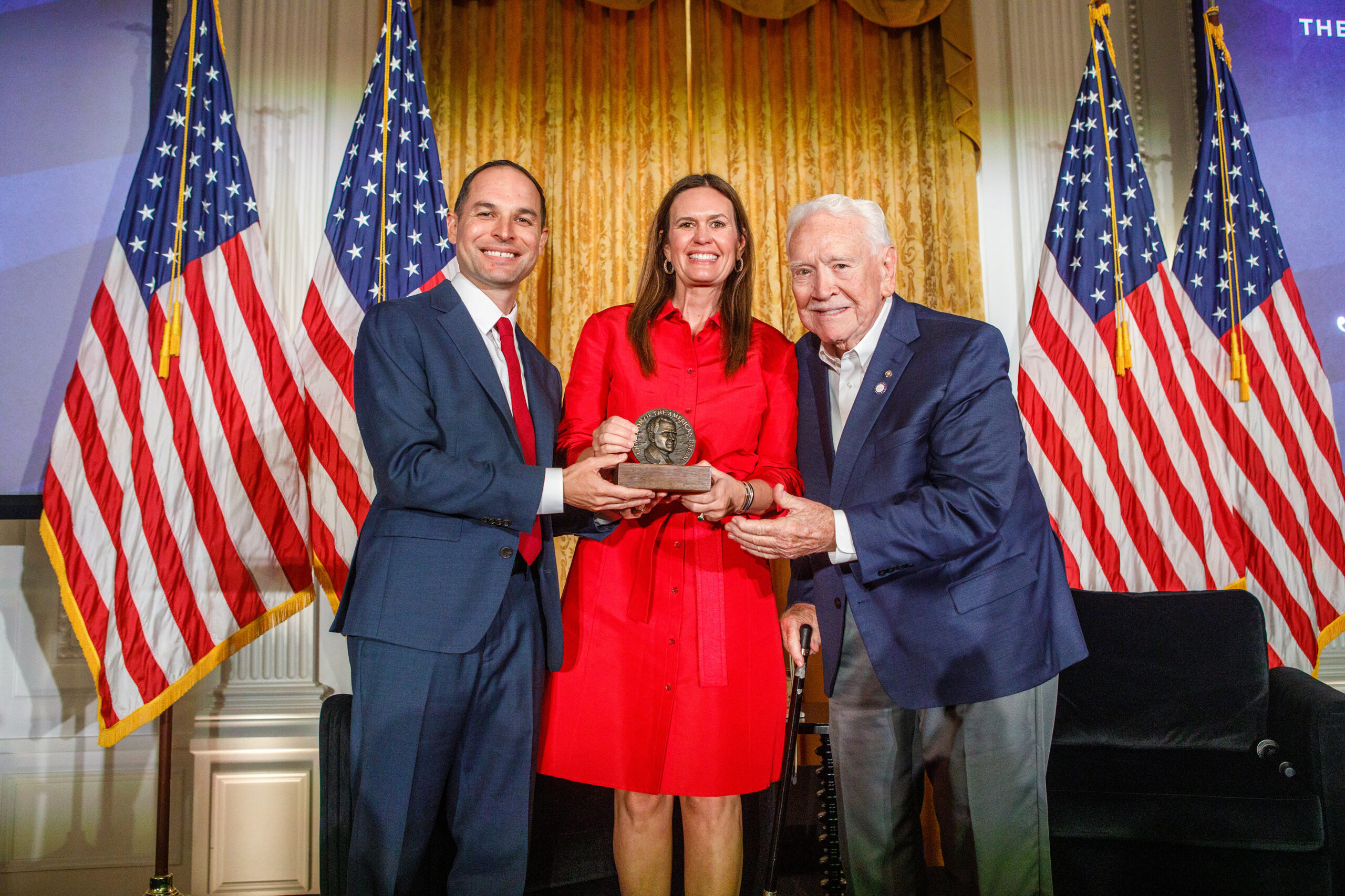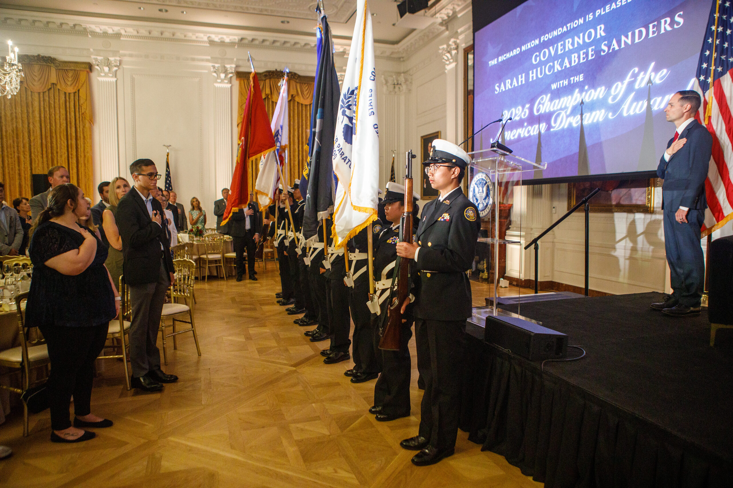 The Champion of the American Dream Award celebrates individuals who embody the ideals of hard work, service to others and an unwavering commitment to the promise of America, principles championed and exemplified by President Richard Nixon. Joe Lopez, acting President & CEO of the Nixon Foundation, was joined by Foundation supporter and civics education champion Doy Henley to present the award to Governor Sanders.