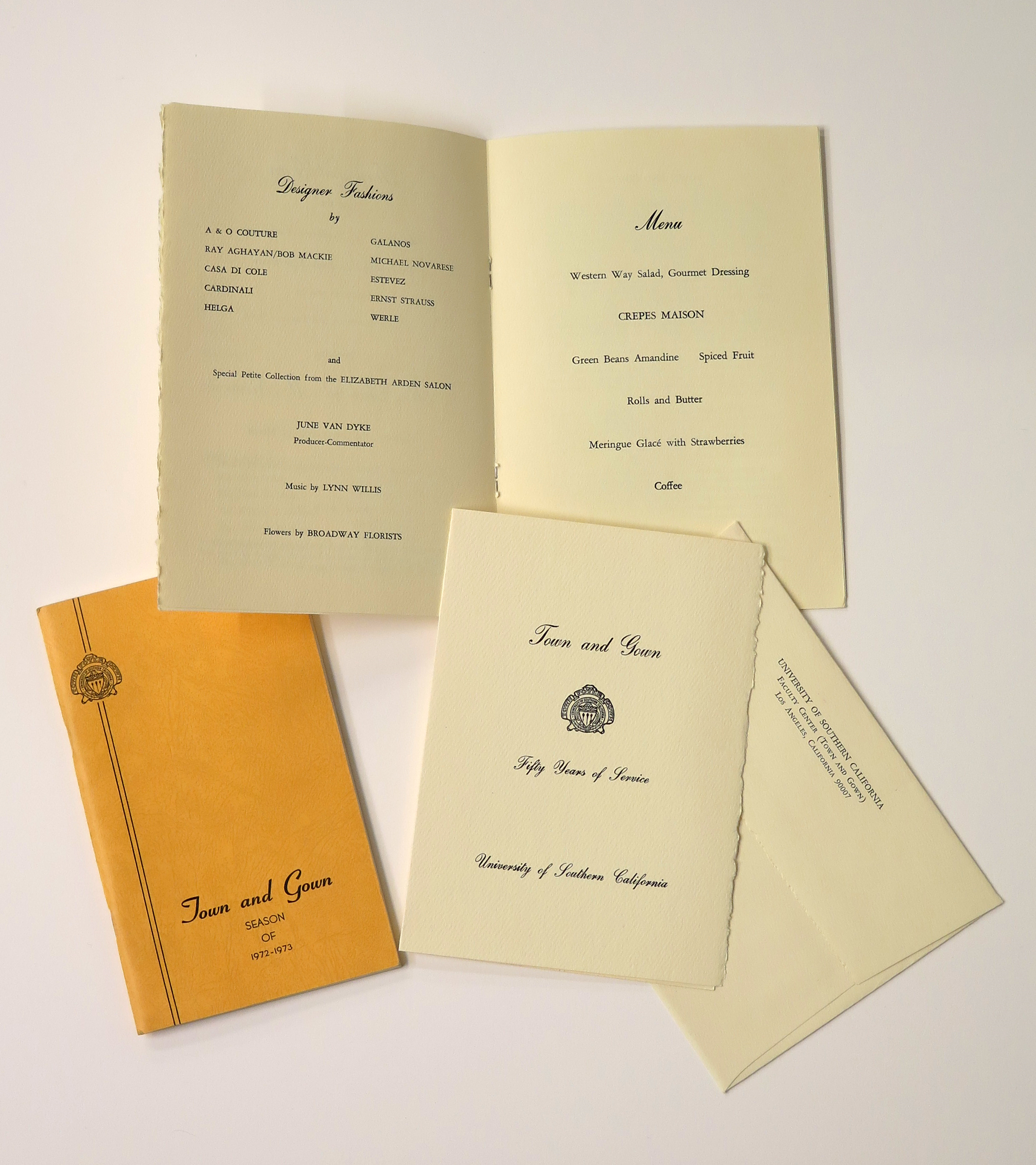 Town & Gown related artifacts housed at the Richard Nixon Library. Pictured in the first image (top to bottom, left to right): Program for a Benefit Luncheon and Fashion Show honoring Mrs. Richard M. Nixon, March 29, 1973; Member Directory, Season of 1972; Invitation and Envelope for a Benefit Luncheon and Fashion Show celebrating 50 years of service to the University of Southern California honoring Mrs. Richard M. Nixon, March 29, 1973