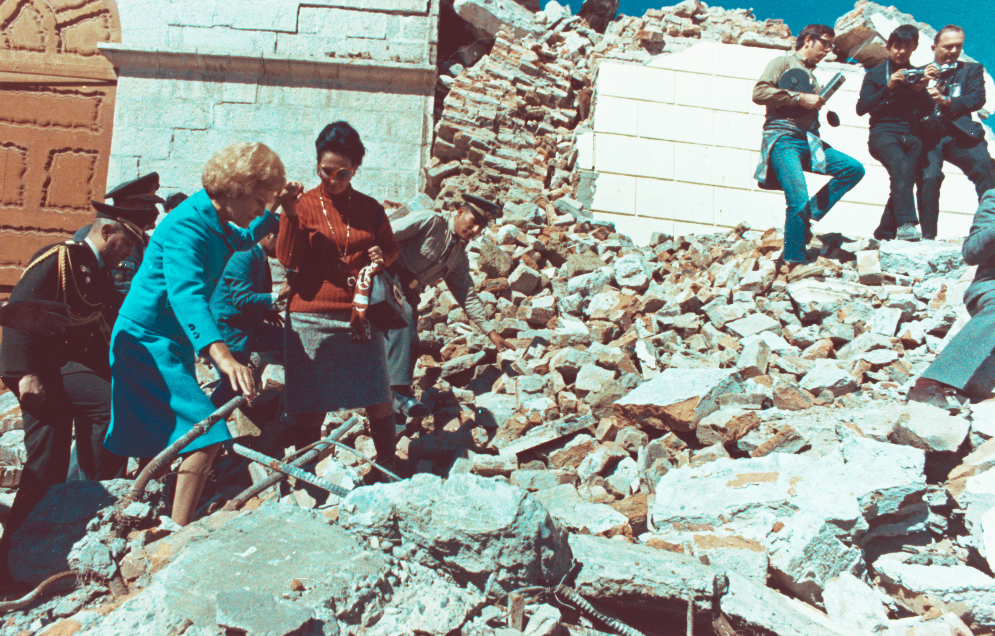 Pat Nixon climbing over rubble in the mountain village of Yungar in Peru in June 1970 with Peruvian first lady, Consuelo Velasco, after the catastrophic 7.8 earthquake struck the country. As Goodwill Ambassador, the first lady brought cargos of food, clothing, and medical supplies to the people of Peru