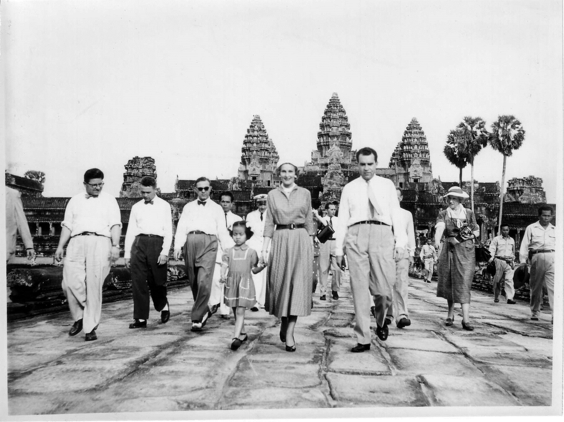 Second Lady Pat Nixon holding hands with a little girl in Cambodia on her first Goodwill trip in November 1953. Behind them is the ancient city of Angkor Wat, hidden for centuries deep in the Cambodian jungles and the largest religious monument in the world.