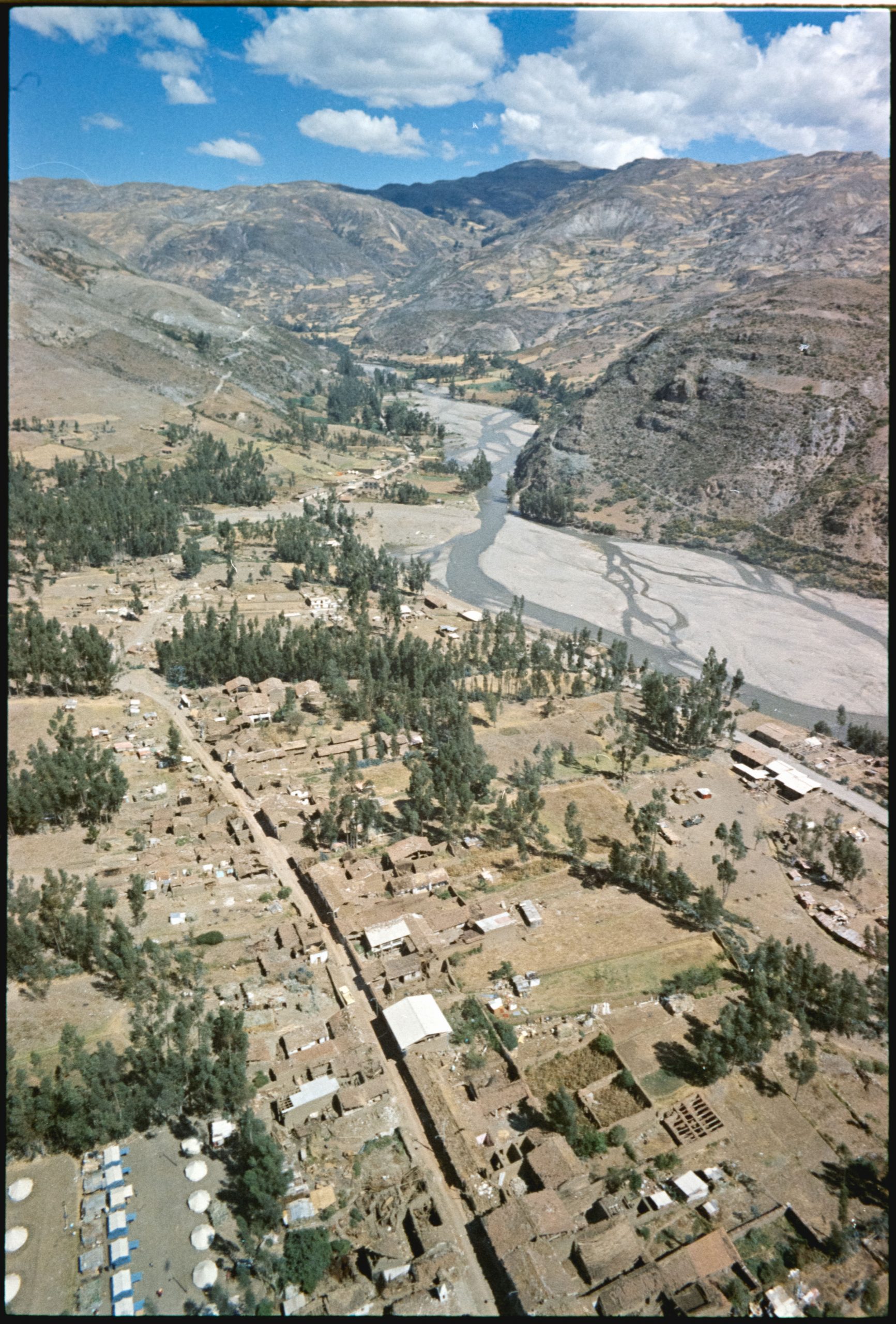 On the second day the two first ladies flew on a cargo jet to the areas most devastated by the earthquake. “Because the cargo plane was not equipped for passengers, Mrs. Velasco was strapped into the co-pilot’s seat, and [Mrs. Nixon] sat, without a seat belt, on a chrome-and-plastic kitchen chair that had been bolted hurriedly to the floor of the plane,” wrote Julie Nixon Eisenhower in Pat Nixon: The Untold Story. The mountainous Yungay and Huaraz areas of Peru were the most impacted.
